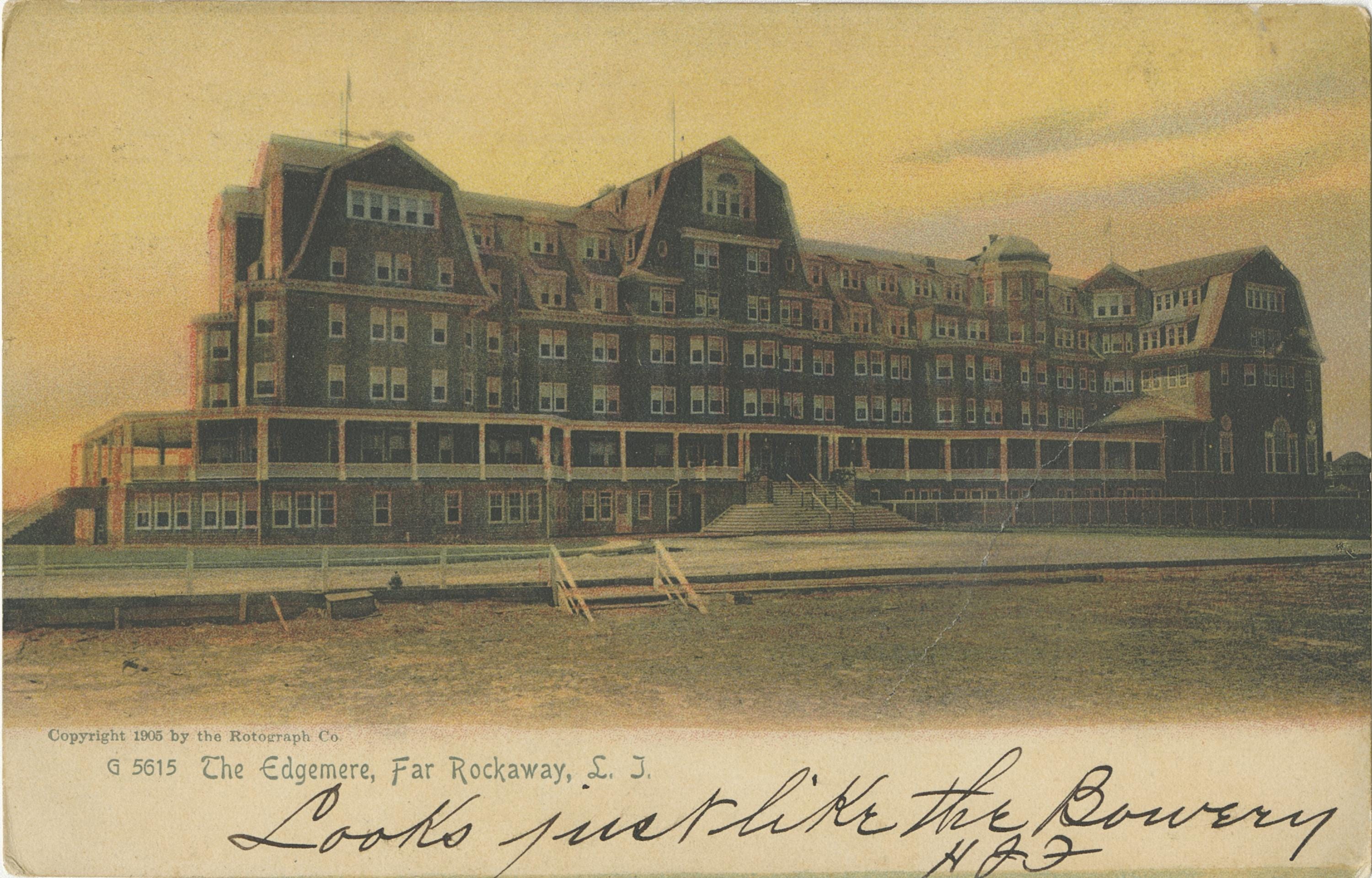 Ever since the cholera outbreak of 1833, the Rockaways had been a popular escape from the city's heat (and bacteria). The introduction of a ferry route in 1864, followed by rail service in 1869, further cemented Rockaway’s status as a summer destination. At the height of its popularity, Edgemere boasted over 60 hotels.