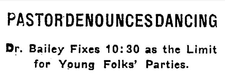 At least according to Reverend Dr. Edwin D. Bailey, pastor of the Prospect Heights Presbyterian Church, who published a fiery screed lamenting the new “dancing mania” as a “growing evil” luring youth away from their studies and religious duties. Reverend Bailey, who sounds like a ball of laughs, asserted that “excessive indulgence in pleasure is not conducive to good character, good scholarship, good morals, or good behavior.”