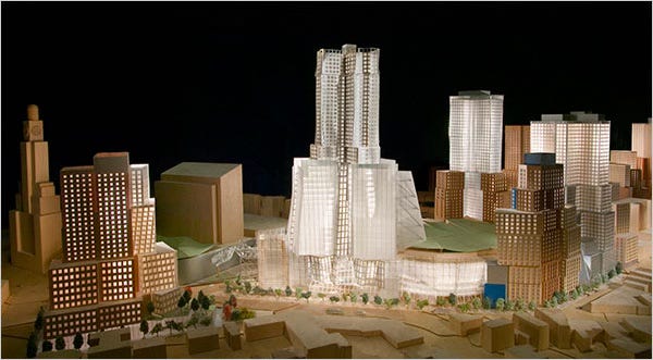 In 2003, a proposal was unveiled for Atlantic Yards, billed as the densest real estate development in U.S. history. The plan consisted of 16 high-rises and a flashy Frank Gehry–designed sports arena covering 22 acres, most of it with a little less than half of it to be built atop an MTA rail yard on Atlantic Avenue between Flatbush and Vanderbilt Avenue.