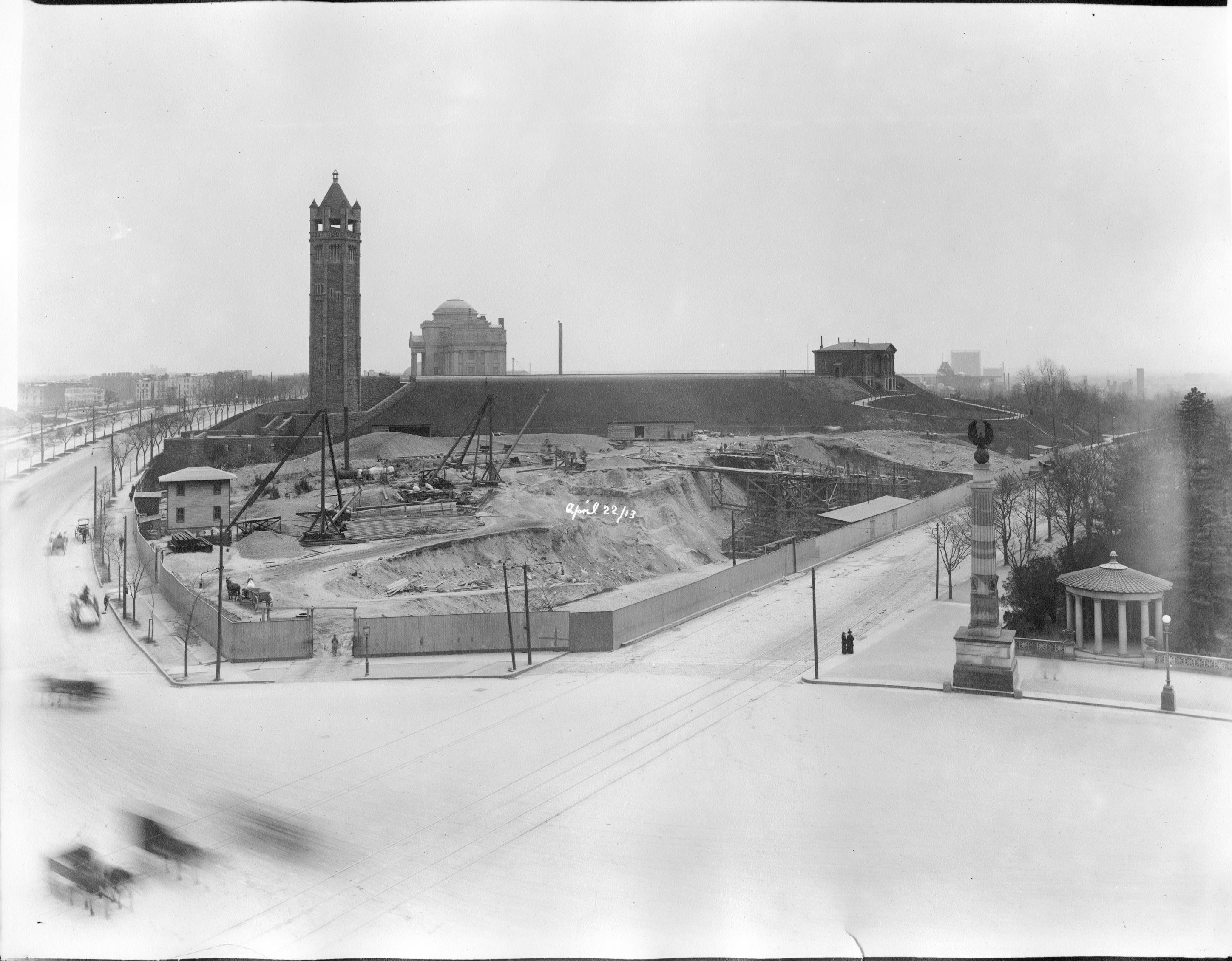 Olmsted and Vaux’s plan called for an elliptical plaza at the north end of the park, envisioned as its main entrance. Initially known as Park Plaza, the area consisted of little more than earth embankments and the unfortunately named “Fountain of the Golden Spray.” The Parks Commission was not impressed: “It is devoid of all life and is a stony waste. It is suggestive of Siberia in winter and Sahara in summer.”