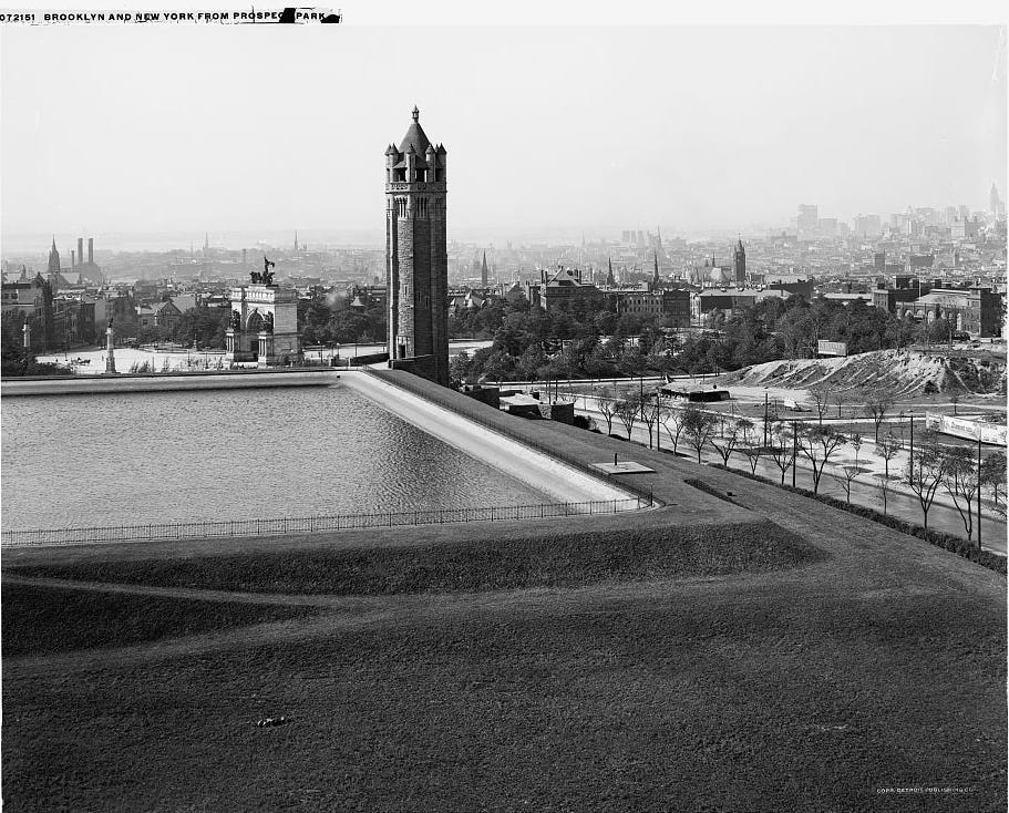 The park opened in 1867 and almost immediately became an “indispensable Sunday resort for the toiling thousands of Brooklyn.”2 By the 1930s, views of the Heights of Guan were long gone beneath haze and construction. With Brooklyn now part of New York City and connected to the Catskill Aqueduct, the Mount Prospect reservoir became obsolete and was eventually filled.