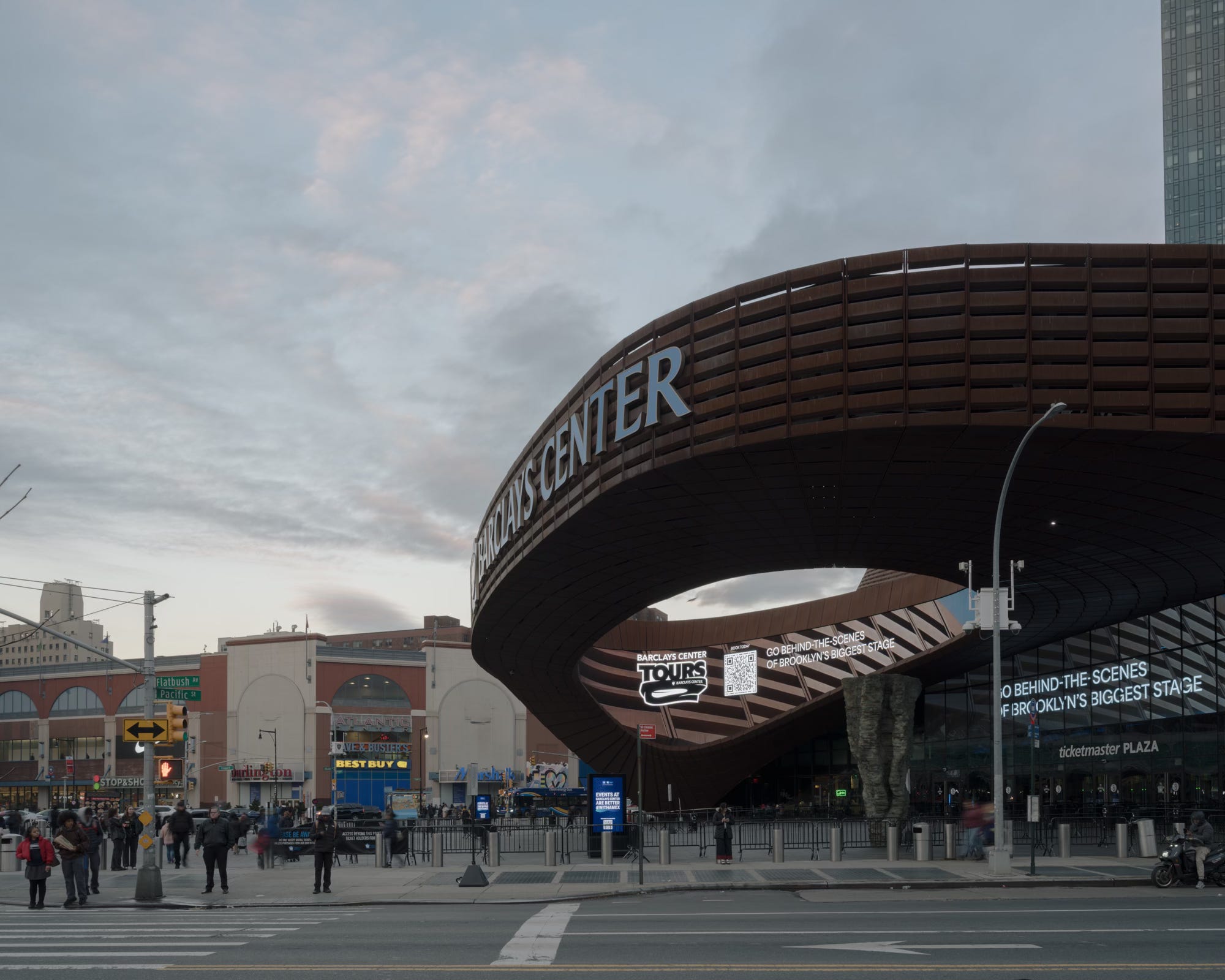 Despite fierce opposition, the project proceeded. Goldstein vacated his apartment in spring 2010. Two years later, the Barclays Center opened with eight consecutive sold-out concerts by Jay-Z, who owned a small percentage of both the Brooklyn Nets and the building itself. The original Gehry design had been scrapped, replaced by a more utilitarian stadium that was wrapped in an undulating latticework of 12,000 rusty-steel panels that were said to evoke the “color and scale of adjacent brownstone blocks.”
