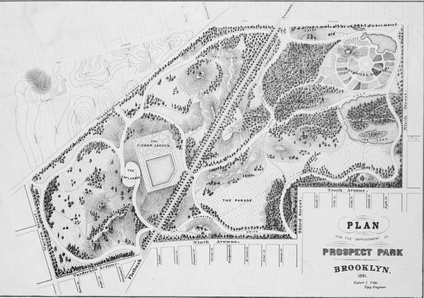 The Civil War put those plans on hold, and, in the midst of their massive Central Park project, landscape starchitects Calvert Vaux and Frederick Law Olmsted replaced Viele as the lead designers. Unhappy with how Central Park’s crosstown transverses disrupted the flow of its landscape, they designed Prospect Park to function as one uninterrupted expanse and enlarged the park while moving it entirely south of Flatbush Avenue. Mount Prospect, the park’s namesake, would not be incorporated into Prospect Park’s final design.